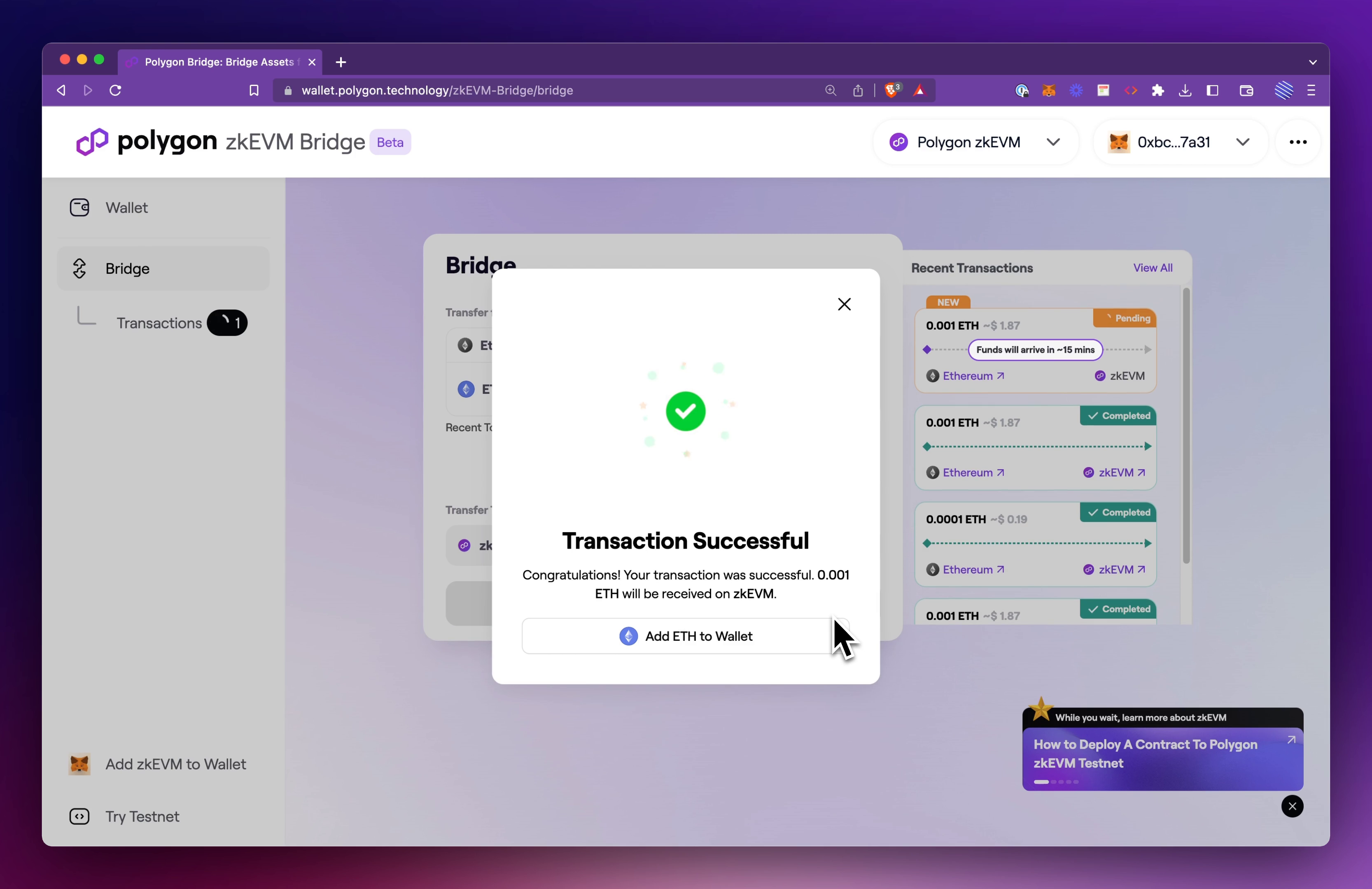 In the “Transactions” view, you can see pending or completed transactions. This is a record of all L1 -> Polygon zkEVM transactions, showing that you’ve signed and agreed to the smart contract locked in L1, and enabling you to activate the equivalent funds in a smart contract in L2.