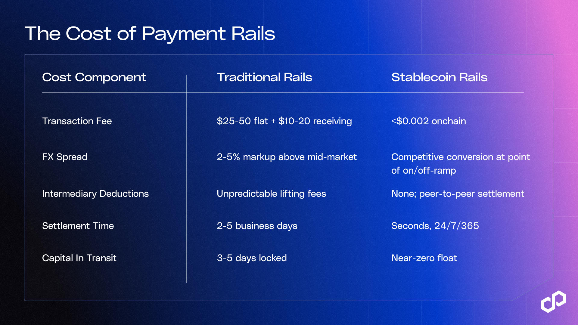 Onchain fees are not the whole picture; on/off-ramp fees and FX conversion at the fiat legs still apply. The savings come primarily from eliminating intermediary deductions, reducing float costs, and removing the prefunding capital requirement.