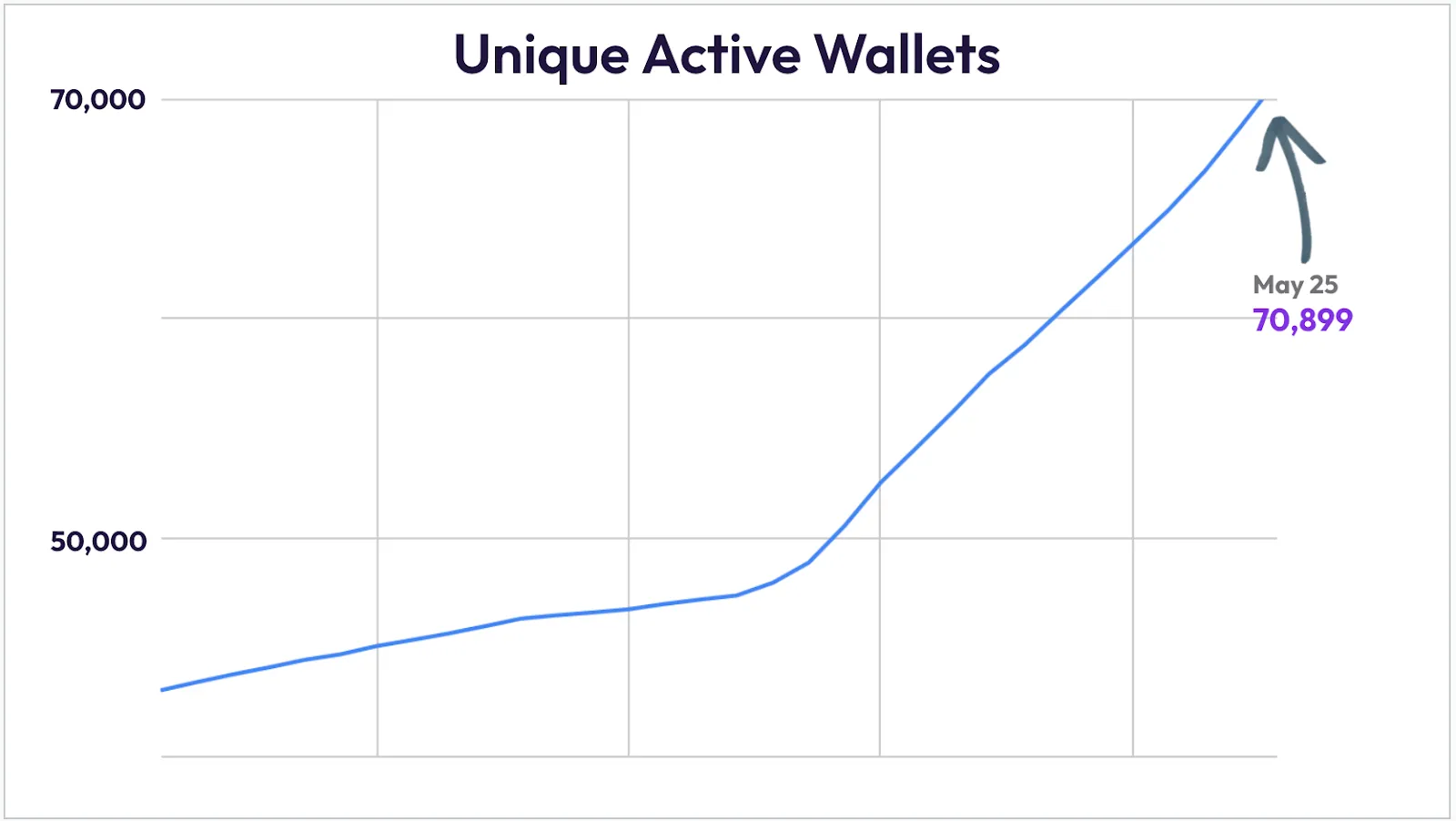 Lower fees and more liquidity then leads to more users. From April 25 to May 25, unique active wallets grew by 54%, with the sharp increase following the new assets bridged on May 15.
