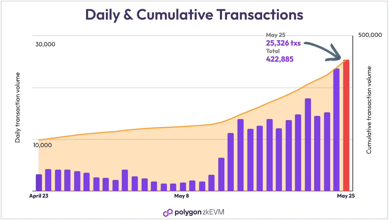 Over the last 30 days, single-day transaction volume broke all-time highs several times. On May 25, Polygon zkEVM Mainnet Beta processed more than 25k transactions.