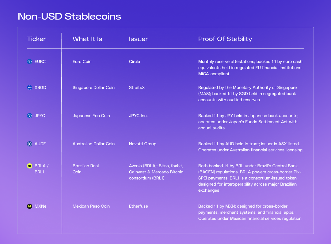 - For enterprise payment teams operating in LATAM, Europe, or APAC corridors, non-USD stablecoins can reduce FX conversion steps and costs by keeping the payment in the destination currency through more of the journey.