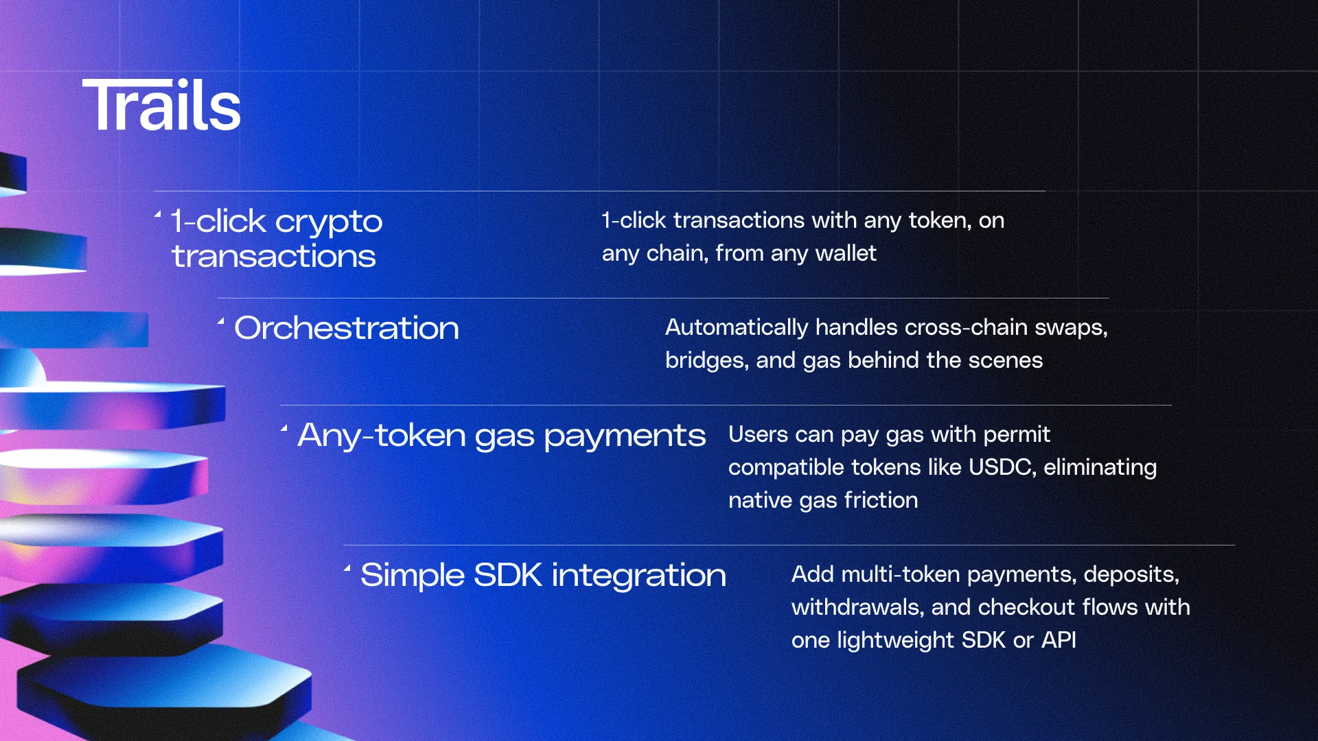 Trails can accelerate orchestration for the Open Money Stack. It is a 1-click cross-chain routing and intents engine that automatically handles bridging, swapping, and execution across networks. Instead of forcing applications or users to reason about chains, liquidity, or routes, Trails moves money where it needs to go and settles it correctly. This is critical for payments: money arrives as expected, without exposing end users or payments teams to onchain complexity.