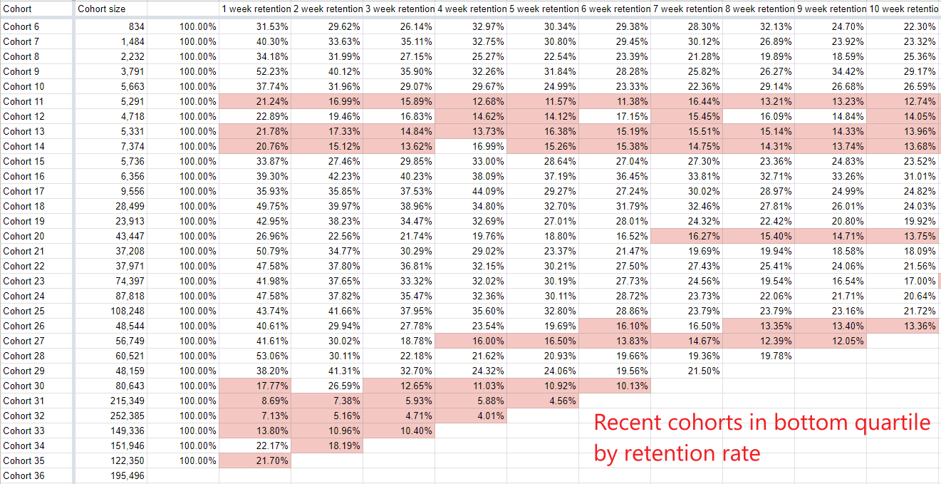 Finally, we see that retention remains elevated relative to the past few weeks. That said, historically, retention rates remain low, with the most recent cohorts remaining in the bottom quantile.