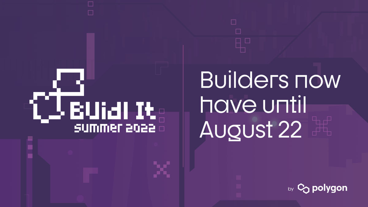 Polygon is bumping the deadline for entries to our BUIDL IT 2022 virtual hackathon. You have until Aug. 22 to get your projects in tiptop shape before sending them to the judges. Winning projects will take home $500,000 in prizes!