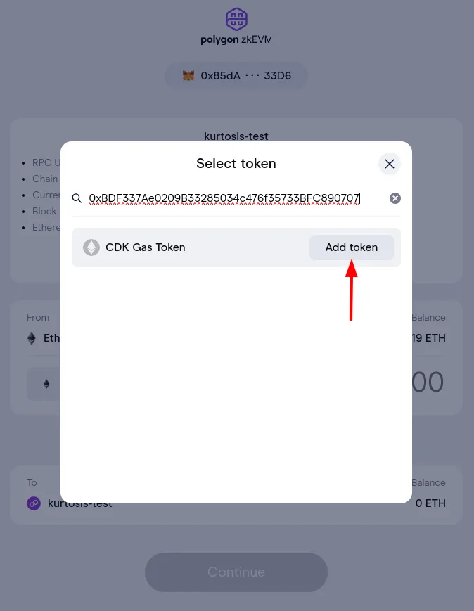 In the modal, you’ll want to paste the ERC-20 gas token address that you found earlier, with this command: