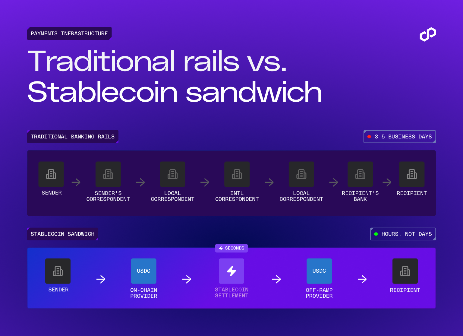 The settlement leg (the stablecoin transfer in the middle) takes seconds on networks like Polygon. The total end-to-end time depends on the on-ramp and off-ramp providers handling fiat conversion at each end. In optimized setups, same-day or same-hour fiat-to-fiat settlement is standard. This compares to 1 to 5 business days through traditional correspondent banking.